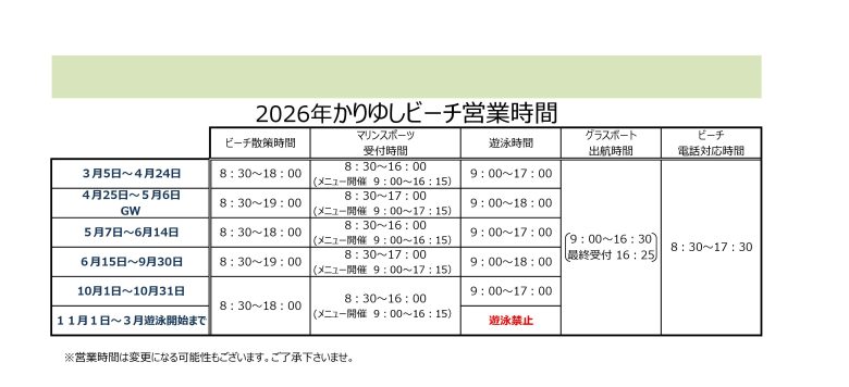 2026年度のビーチ散策時間、遊泳時間、マリンスポーツ受付時間、グラスボート出航時間などの詳細は、下記画像をご確認ください。
