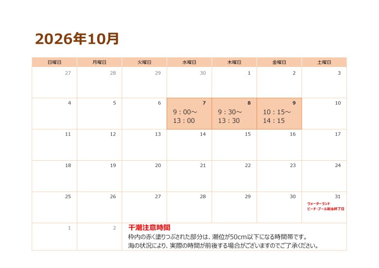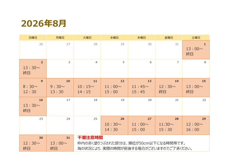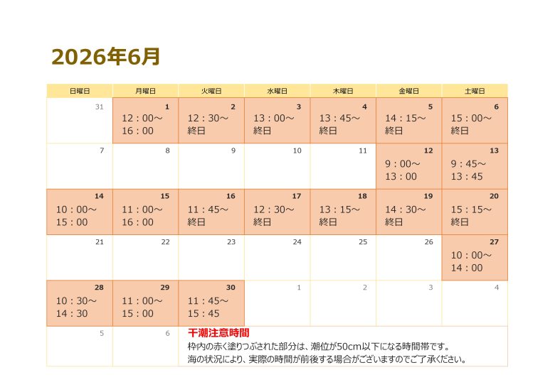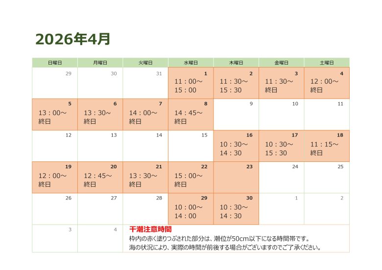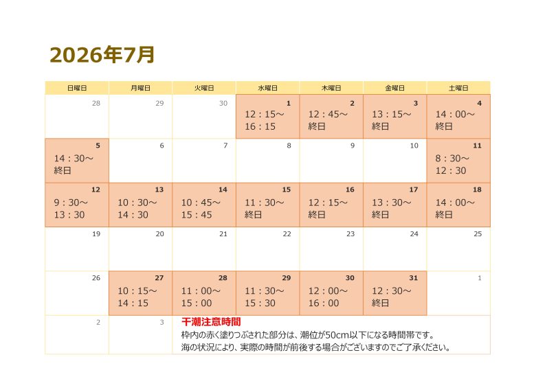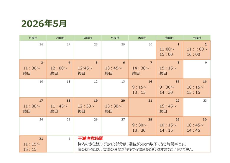下記の日程におきまして、潮位が50cm以下になる時間帯がございます。