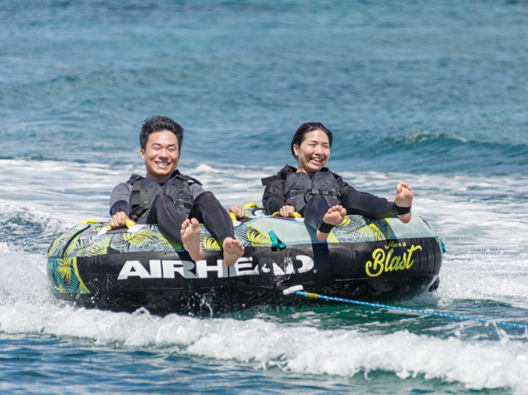 ジェットスキーに引っ張られ、右に行ったり左に行ったり。波しぶきを浴びながら、遠心力とバランスを楽しみましょう。
