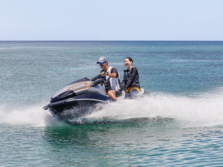 海の上をすべるように走る速度は40キロ-50キロ。マリンスポーツのなかでもスピード感はとびきりです。インストラクターの運転に同乗するので、気軽にお楽しみいただけます。
