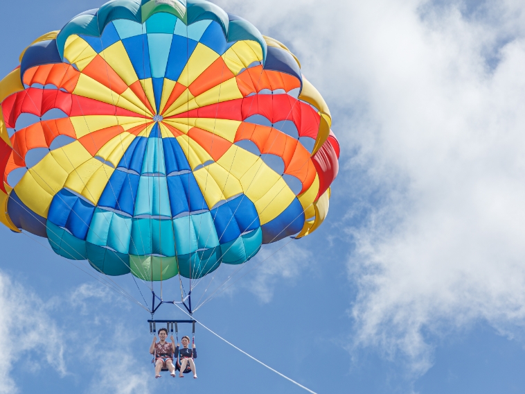 背中に専用のパラシュートを背負い、船でひぱって海上を飛んでいく迫力満点のアクティビティ!